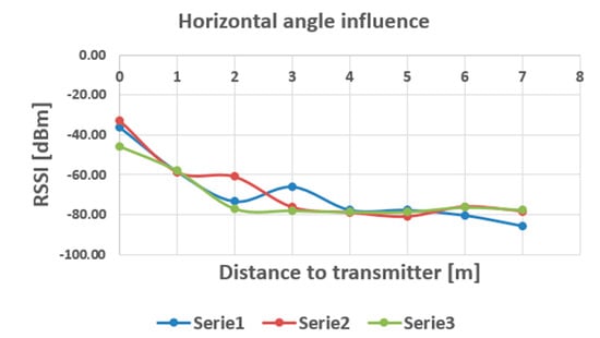 Influence of horizontal position on the RSSI readings (Serie 1—H = 0o, Serie 2—H = 45o, Serie 3—H = 90o).