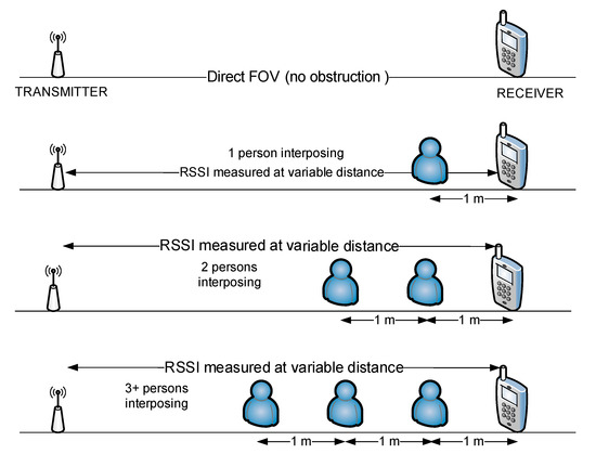 In order to determine the influence in RSSI readings that any interposing object may have, a typical situation has been taken into consideration: influence of the human bodies. This situation is frequently met especially in public areas where people move in different directions and the absorption of electromagnetic waves may also influence the values of RSSI. A second set of tests was performed in the laboratory, in the same conditions described above, but with successive interposing of human bodies between the transmitter and the receiver.