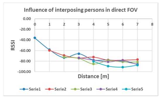 Readings of RSSI for variable number of persons sitting in direct communication line (Serie 1—no persons (FOV), Serie 2—1 person, Serie 3—2 persons, Serie 4—3 persons, Serie 5—4 persons).
