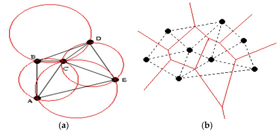 Representations of the Delaunay triangulation (a), Voronoi diagrams combined with the Delaunay algorithm (b).