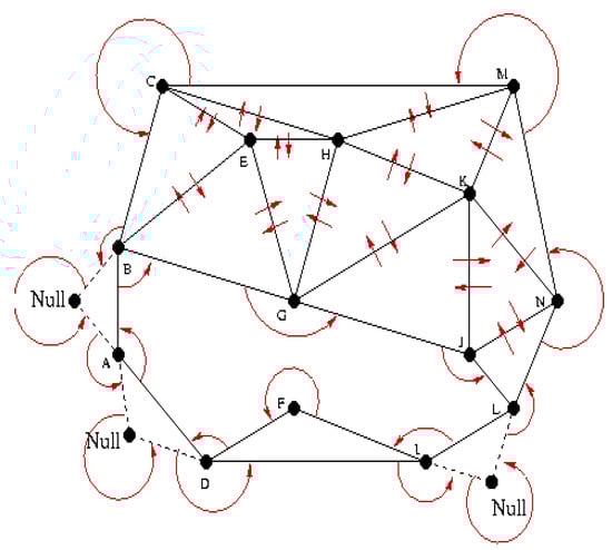 The implementation steps of the Delaunay algorithm: the triangle is defined by 6 member data, 3 vertices and 3 adjacent triangles. If a triangle is divided, 2 vertices remain, and we will make the 3rd NULL. Each triangle is generated such that the vertex one is smaller than the vertex 3, and the second vertex is oriented clockwise with respect to the vertex 1 and the vertex 3 with respect to 2. If there is no adjacent triangle opposite a vertex, then the neighboring triangle is assigned to be the first triangle encountered in the path of the respective peak. The process is repeated until the structure is completed and the triangularization is completed. The implementation of the algorithm is presented in Figure 23.