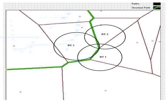 Figure 24 shows the application developed for estimating the travel trajectory, based on the topological map with the Voronoi diagram for calculating the shortest path based on the Delaunay triangulation algorithm. The calculation of the travel trajectory is based on the BT 1–3 reception sensors and the values obtained for RSSI and AoA related to a MAC address.