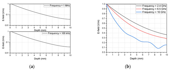 E-field attenuation in the brain tissue model for frequencies of (a) 100 kHz, 1 MHz, (b) 2.4 GHz, 6.5 GHz, and 10 GHz.
