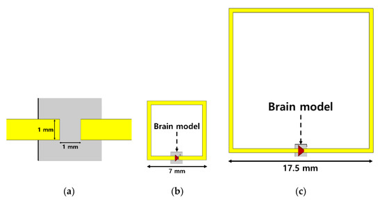 Top view of (a) the gap of SRR, (b) 2.4 GHz, and (c) 6.5 GHz SRR contacting the brain model.