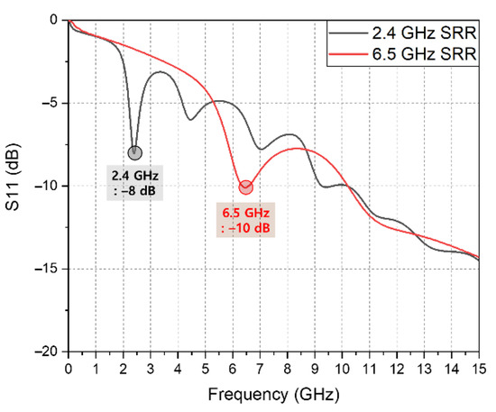 The lower the frequency, the lower the attenuation, but the larger the size of the probe which uses a resonant structure in the system. Since the application of this work is to develop a system for behavioral experiments in mice, the dimension as well as the attenuation is a limiting factor. Figure 3 shows a split ring resonator (SRR) resonating at each frequency. Given that the probe must be matched by resonance at the desired microwave frequency, a simple SRR structure can serve to predict the size of the entire probe. As mentioned above, the attenuation constant is large at 10 GHz, meaning that the size comparison is conducted in only the two frequency bands of 2.4 and 6.5 GHz. The electric field is concentrated in the gap, acting as a capacitor, and the metal line returning to the loop creates resonance as the inductance. When the mouse brain is assumed to be a sphere, the size of the area where the probe comes into contact with the brain surface is limited because the radius is smaller than 5 mm [14]. Considering the realistic environment of the probe touching the brain, the gap size of the SRR is set to 1 × 1 mm and the brain model has contact including the gap area, as shown in Figure 3a. The corresponding SRR sizes in Figure 3b,c are 17.5 × 17.5 and 7 × 7 mm. The resonance of each SRR can be seen in the S-parameter graph in Figure 4. In the simulation with the brain model, it can be seen that the 6.5 GHz SRR shows a S11 value of −10 dB, and matching is well performed. In order to make different resonant frequencies with the same capacitance, the SRR size must be varied. The 2.4 GHz SRR occupies a 6.25 times larger area than the 6.5 GHz SRR, and when implemented through a PCB, the 2.4 GHz SRR is 6.25 times heavier. Currently, in the case of a small microscope that can be mounted on the head of a mouse, the overall size is 100 mm2 × 22 mm (area × height) [15]. Compared to the conventional mouse head mount device, the size of the 2.4 GHz SRR has not been verified for conformity, whereas the 6.5 GHz SRR is smaller than the verified device size. Considering attenuation, matching to brain tissue, and the size of the probe with a mountable size on the mouse head, it is considered that the 6.5 GHz frequency is suitable for MBS behavioral experiments.