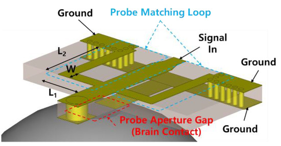 This section describes the geometry, frequency response, and the distribution of electric fields within the brain model of the probe for brain stimulations. Figure 5 shows an exploded view of a probe that includes an RF connector or chip-mounted region for implementing a chip-on-probe MBS system and an aperture gap in contact with the brain. The area of the designed probe is 96 mm2 or less, which is smaller than the aforementioned 100 mm2 reference area. A Rogers RT6010 substrate having a thickness of 635 μm is used as a substrate. It has a dielectric constant and loss tangent of 11.2 and 0.0022, respectively. To deliver the microwave signal to the brain using the 6.5 GHz SRR shown in Figure 3b, it is conventionally fed by inductive coupling through a microstrip line [16]. In this indirect feeding method, there exists some loss by coupling, and the gap between the line and SRR causes the dispersion of the electric field, making it difficult to focus the field onto the desired site. Therefore, in this work, a structure is proposed in which the electric field is formed only in the gap of the SRR via direct feeding to the SRR, as shown in Figure 6. The gap of the SRR is located at the bottom of the PCB, where the brain is in contact, to achieve the intention of delivering the focused electric field to the brain model. When the matching loop of the SRR required for resonance is located on the bottom surface, identically to the gap, the electric field can be distributed by unintentional coupling. Therefore, the loop is moved to the top of the PCB and connected through an electrical via hole to the gap. The signal is inserted into a resonator with low reflection consisting of capacitance formed by a gap and a symmetrical matching loop that appears to be inductance through a grounded coplanar waveguide feed.