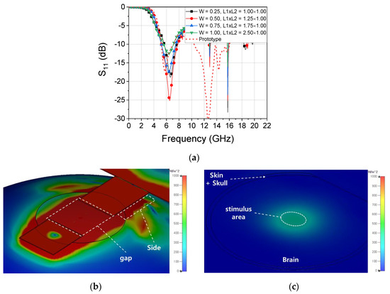 Figure 7a plots the S-parameters for cases where the prototype and proposed probe resonates at 6.5 GHz depending on the loop contact location (L2), length (L1 + L2), and width (W) of the matching loop, which is shown in Figure 6. For comparison, the prototype probe has a structure in which the chip is mounted directly to the probe PCB without an auxiliary PCB. Similar to the proposed probe with various dimensions, the prototype also has a return loss of 12 dB at 6.5 GHz, which is matched to 50 Ohms. As the capacitance value is already fixed in the proposed structure, the inductance value required for 6.5 GHz resonance is determined. As W increases, the length of the loop required to form an identical amount of inductance increases. During the simulation, the average increase in the length should be 0.5 mm for every increase in W of 0.25 mm. Table 1 summarizes the geometry, the insertion loss (IL) at 6.5 GHz, and the 10 dB impedance bandwidth of the proposed probe including the aforementioned modified SRR structure. A total of 12 different modified SRR geometries are used with the probe to acquire resonance at 6.5 GHz. The dimensions of the loop with the best impedance matching to the brain model are a width of 0.5 mm and a 1.25 × 1.0 mm loop size, where IL shows −25.1 dB at 6.5 GHz and a 40.2% of the impedance bandwidth. Figure 7b,c presents simulation results using CST Studio, showing the distribution of the electric field formed at the surface and 3 mm deep when a 10 dBm stimulus signal is applied by attaching a probe to the brain, respectively. In the simulation, a more realistic environment can be utilized through a brain model including the skin and skull. The RF power on the surface of the brain model is distributed not only in the gap of the probe but also on the side of the line. It can be seen in Figure 7c that the power distributed over such a large surface is limited only to the skin surface and is highly concentrated in terms of the distribution at a depth of 3 mm in the model. The targeted hippocampal CA1 neurons are located at 1.9 mm ventral, 1.4 mm lateral to bregma, and 1.2 mm depth from the surface. The field distribution was analyzed at about 3 mm from the probe surface considering the location of the target at 1.2 mm deep from the brain surface and the average thickness of the scalp and skull [17,18]. In a brain model with a 3 mm depth, the stimulus area where power is distributed over 645 W/m2 or more has an oval shape with a long diameter of 2.7 mm and a short diameter of 2 mm [19].