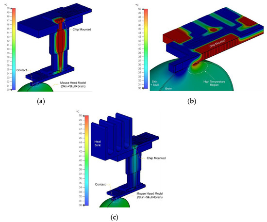 The temperature formed inside the brain is 39 °C or less, indicating that there is no temperature effect. If the additionally secured heat sink is attached to the SMA connector and auxiliary PCB, the temperature at the probe aperture can be lowered by more than 2 °C by effectively releasing the heat of the chip, as shown in Figure 8c. The designed heat sink is 1 × 1 × 1 cm3 in size, has four heat-sinking bars with a thickness of 1 mm, and is attached through a heating pad. Considering the application to be mounted on a mouse, instead of copper with good thermal conductivity, aluminum, which has a specific gravity of 2.7 (one-third that of copper), was selected. Therefore, it was confirmed in a simulation that the heat generated by the chip transferred to the brain was effectively suppressed without affecting the brain tissue using the vertically arranged auxiliary PCB and the attached heat sink.