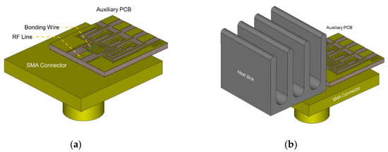 A low-loss transition structure is required to deliver the signal from the chip’s output pad to the end of the SMA connector. As the proposed 6.5 GHz probe was designed considering that a SMP connector would be attached, the transmission loss caused by the vertically attached auxiliary PCB and connector was simulated. Figure 9 presents the layout of the transition structure of the SMA connector from the chip mounted on the auxiliary PCB without and with a heat sink.