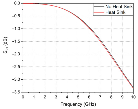 The transferred loss from the chip’s output pad to the end of the SMA connector is shown in Figure 10. The loss of the simulated transition structure at 6.5 GHz is 1.1 dB, including the wire bonding effect. Given that the designed aluminum heat sink is attached over the SMA connector near the RF line, an effect of the heat sink on the RF signal is seen. As shown in Figure 10, even when the heat sink is attached, the loss in the transition structure is 1.2 dB, i.e., only a 0.1 dB difference. Through this, it was confirmed that the heat dissipation of the chip that occurs during the in-vivo experiment is solved by the heat sink. Thus, this design is feasible for use as it also has a negligible effect on the RF performance.
