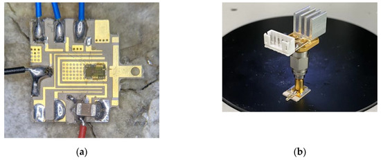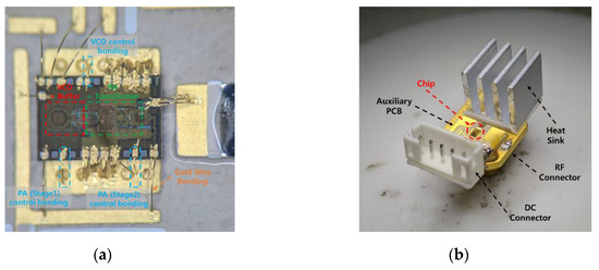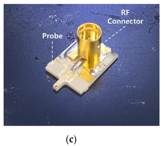 Figure 11a shows a top view of the fabricated chip mounted on an auxiliary PCB. VCO, a buffer, the PA, and the transformer circuits are all integrated on a single chip and fabricated in the 0.28 μm silicon-on-insulator CMOS process. Each pad of the chip is connected to a ground or a metal line with DC voltage applied through gold wire bonding. Three grounded wire bondings were added to control the oscillation condition and the gate voltage of each stage’s common-source amplifier of the PA. Figure 11b shows a photograph of the manufactured auxiliary PCB with the supplementary parts of the chip, RF connector, DC connector, and heat sink. Appropriate voltages are applied through the DC connector to drive the chip, and its performance can be verified by connecting measurement equipment to the RF connector. The manufactured probe is connected to a 90°-angled RF connector to receive stimulus signals from the chip.