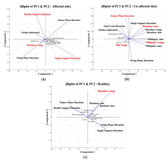 Biplots of selected features by PCs for (a) the affected side, (b) the unaffected side, and (c) healthy side.