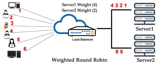 Each weight server, is used in turn. The weighted round robin algorithm is similar to the round robin one, but is static in nature, so it doesn’t work by changing the weight of the server on the wing. On the other hand, the number of servers is not limited and frequently replicated immediately after a full map is re-published when a server increase. It uses less CPU to run too. A weight is allocated to the respective server established on norms chosen by the cloud system administrator; the most frequently used ways are the server’s visitors‑handling capability. The higher the weight, the higher the percentage of visitor requests the server accepts, as in Figure 2. For example, server1 is allocated a weight of 4 and server 2 a weight of 2. The load balancer forwards four requests to server 1 for each two it sends to server 2. If some virtual machines have more resources in vCPU, Ram, GPU, and other specifications, then the weighted round robin algorithm is used. With the help of weighted round robin, cloud admin can easily distribute the web traffic on high resource virtual machines by defining weight on it. In advance, all the estimation requires implementing this algorithm, and this is a major drawback.