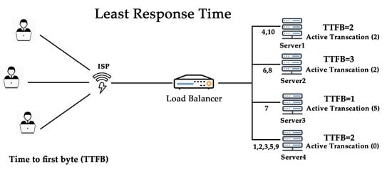 The least response time algorithm directs visitors to the server with the least amount of active connections and the lowest common response time, as shown in Figure 5. Least connections are used where two parameters (least active connections and low response time) are combined with per VM. However, it requires high performing virtual machines; if simple performing virtual machines are used, then the unequal route of traffic might be shown. This algorithm is not recommended for cookie-based session applications.