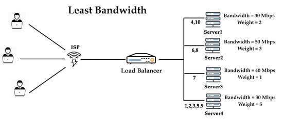 This least bandwidth algorithm processes visitors in megabits (Mbps) per second, sending users’ requests to the server with the smallest Mbps of visitors as given in Figure 6. The least bandwidth algorithm is very handy when all virtual machines in cloud infrastructure have different network bandwidth. It requires approximate network bandwidth, which is difficult to do in networks where the packet size of the data varying, and network bandwidth might be exhausted.