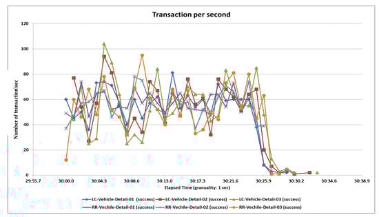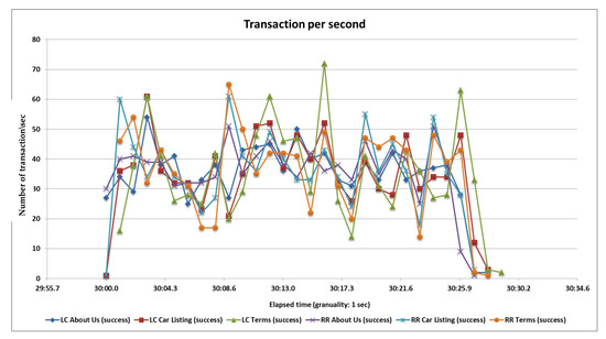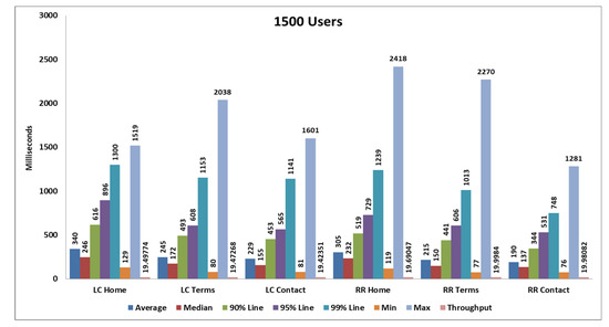 We perform our test with 1500 samples (samples means users), 1500 samples are divided into three pages and each page serves 500 samplers and every 20 s, 25 samples are hitting the server. After completing all samplers’ requests, we generate tabular reports as well as graphs. Performance analysis with different parameters on two algorithms and their statistical results and graphs obtained from the first load test are shown in Table 4 and in Figure 12 and Figure 13.