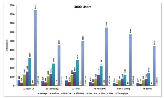 In the second case, we perform a test with 3000 samples, divided into three pages and each page serves 1000 samplers and every 40 s, 25 samples are hitting the server. After completing all samplers’ requests, we generate tabular reports as well as graphs. Performance analysis with different parameters on the two algorithms and their statistical results and graphs obtained from the second load test are shown in Table 5, Figure 14 and Figure 15 below.