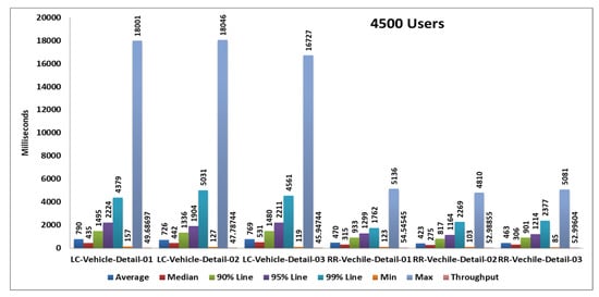 In the third case, we test 4500 samples divided into three pages and each page serves 1500 samplers and all samplers’ hitting the server in the span time of 1 min. After completing all samplers’ requests, we generate tabular reports as well as graphs. Performance analysis with different parameters on two algorithms and their statistical results and graphs obtained from the second load test are shown in Table 6, Figure 16 and Figure 17.