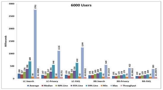 In the fourth case, we perform the test with 6000 samples divided into three pages and each page serves 2000 samplers and all samplers’ hitting the server at the same time. After completing all samplers’ requests, we generate tabular reports as well as graphs. Performance analysis with different parameters on the wo algorithms and the statistical results and graphs obtained from the second load test are shown in Table 7, Figure 18 and Figure 19.