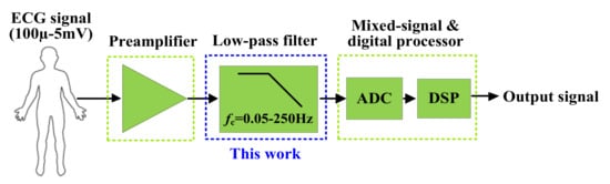 Continuous-time filters are widely used in biomedical systems devoted to applications in electroencephalographic (EEG), electromyographic (EMG), and electrocardiographic (ECG) systems. The biological signals processed in these systems typically occupy the frequency range of 0.05–250 Hz, with an amplitude of 15 µV–5 mV [1]. In more detail, the frequency/amplitude ranges for EEG, EMG, and ECG signals are 0.05–60 Hz/15−100 µV, 10−200 Hz/0.1−5 mV, and 0.05−250 Hz/100 µV−5 mV, respectively. Figure 1 shows a typical data acquisition system for ECG signal processing. The pre-amplifier stage amplifies a low-amplitude ECG signal, then the low-pass filter selects the frequency range and eliminates out-of-band noise. The filtered analog signal is converted into digital form by an analog-to-digital converter (ADC) and then it is further processed by a digital signal processing (DSP) block. This work focused on the design of a low-pass filter with the cutoff frequency of 250 Hz. The analog low-pass filters for ECG acquisition systems should be designed to meet specific requirements, such as high dynamic range, low-power consumption, and small chip area. There are many low-pass filters for ECG acquisition systems described in the literature [2,3,4,5,6,7,8,9,10]. The Butterworth approximation is usually used because it provides a better linear phase and flat response within each bandwidth. Considering the analog filters in [2,3,4,5,6,7,8,9,10], one can distinguish two main techniques that have been used to realize the low-pass Butterworth filters: the cascade approach [2,3,4,5,6] and the ladder simulation approach [7,8,9,10]. The cascade structure can be obtained by cascading several biquad filters, which leads to a simple and easy-to-tune realization.