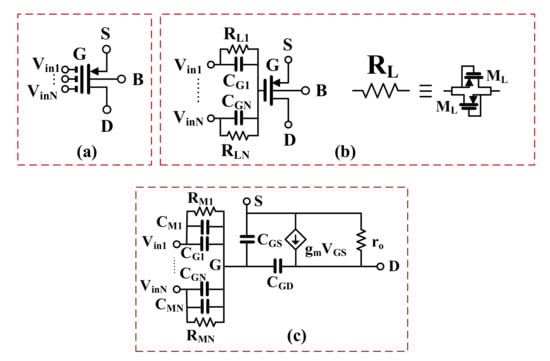 ( = 1…N). The capacitors are shunted by the large resistances , which ensures proper biasing of the gate terminal of the internal MOS for DC. The large resistances can be realized using an anti-parallel connection of two minimum-size MOS transistors operating in a cutoff region, as shown in Figure 4b. The small-signal equivalent circuit of the resulting multiple-input MOS is shown in Figure 4c. Assuming , the gate potential is given by