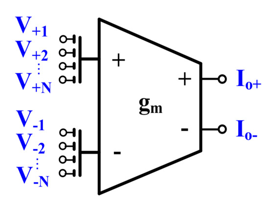 Let us compare noise properties of a fully-differential OTA in Figure A1a, biased with current IB, and a multiple-input OTA composed of n identical OTAs of the same structure, but biased with currents of IB/n (Figure A1b). For simplicity, let us consider only the thermal noise.