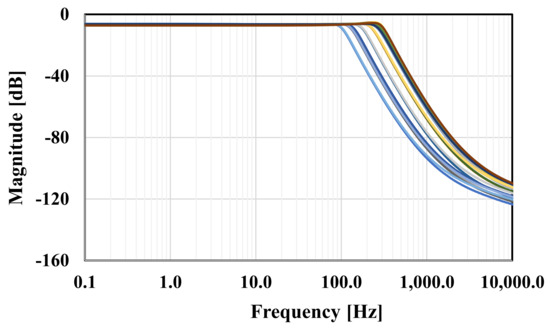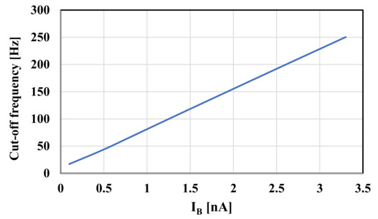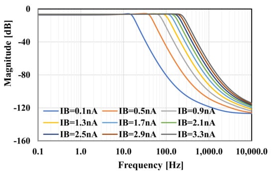 To check the influence of the process, voltage, and temperature (PVT) variations on the filter performance, the corner analysis was performed. The MOS transistor corners (ss, sf, fs, ff), MIM capacitor corners (ss, ff), voltage supply corners (490 mV, 510 mV), and temperature corners (0 °C, 60 °C) were used. The variation of the gain was in the range of −7.2 dB to −6.13 dB while the variation of the cut-off frequency was in the range of 100.6 Hz to 326.7 Hz, as shown in Figure 14. Note that the temperature corner has the most effect of the variation of the frequency response since the circuit operates in a subthreshold region. However, since the circuit is proposed for biomedical applications it is expected that the temperature variation will be less than the chosen temperature corners. Although the variation of the cut-off frequency is large, the needed value can be simply re-adjusted by the bias current. Note that the amplitudes of the bumps at low bias currents in Figure 11 and at higher frequencies in Figure 14 do not exceed 1.6 dB and do not affect stability of the circuit in a significant manner.