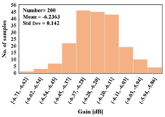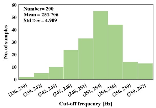 The Monte Carlo analysis with 200 runs was performed for the filter gain and cut-off frequency as shown in Figure 15 and Figure 16, respectively. The mean value of the gain was −6.23 dB with standard deviation of 0.14 dB, while the mean value of the cut-off frequency was 251.7 Hz with standard deviation of 4.9 Hz. Figure 17 shows the output referred noise density of the filter. The integrated in-band noise between 0.1 Hz to 250 Hz shows that the output referred noise is 77 μVrms. Figure 18 shows the performance of the proposed filter in processing the ECG signal where (a) depicts the ECG signal with a distortion signal (5 mV/500 Hz) that was applied at the input of the filter and (b) depicts the filtered output signal.
