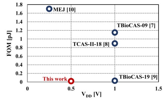 The summary and comparison between the proposed filter and some previous works are shown in Table 1. Only the fifth-order Butterworth low-pass filters simulated by the LC-ladder type filter and suitable for ECG signal acquisition [7,8,9,10] have been selected for comparison. From Table 1, it is clear that the proposed filter has a lower number of active devices, power consumption, and figure-of-merit (FOM). Finally, the FOM versus VDD of fifth-order low-pass filters are shown in Figure 19. Compared with the works in [7,8,10], the proposed filter offers clearly better FOM. The FOM is even slightly lower than the one in [9] with half the value of VDD. It is worth noting that the estimated chip area of 2-inputs and 3-inputs OTA based on the MIGD technique is increased by approximately 5% and 8%, respectively, compared to that of a single-input conventional OTA with the same transistor dimensions. This confirms the advantage of this technique of saving chip area. Note, a similar conclusion of this advantage based on experimental results is stated in [11]. The small chip area of the proposed filter is evident in Table 1 compared with that of [10] that used off-chip capacitors for filter realization.