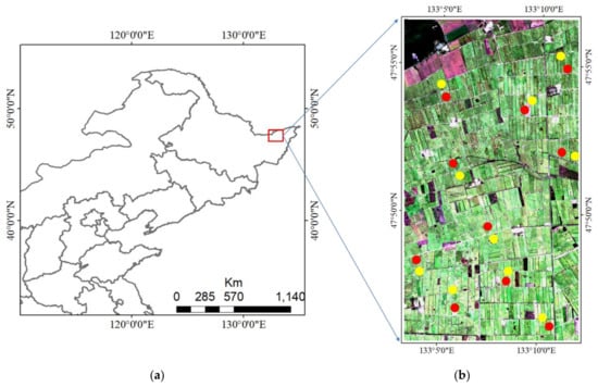 Figure 1. The study area (a) and location of the sample fields overlaid on a Sentinel-2 true color synthesis image (b) acquired on 17 September 2019. Yellow circles indicate healthy rice plots and red circles indicate lodge plots.