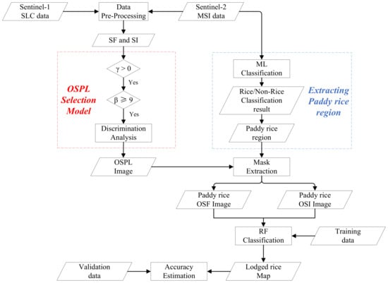 In this study, 10 Radar features of Sentinel-1 and 10 spectral indices of Sentinel-2 were evaluated for lodging rice sensitivity, and a selection model was developed for acquiring the optimal sensitivity parameters for lodging rice (OSPL). Optimal SAR features (OSF) and optimal spectral indices (OSI) were then selected based on the OSPL model. Three classification results were acquired using the Random Forest (RF) classification method with the input of OSF, OSI and integrated OSF–OSI. The accuracy of the three classification results was evaluated using the validation data and confusion matrix.