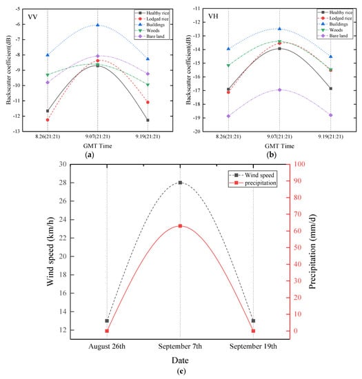 The backscatter behavior of rice and other typical features (buildings, woods and barren land) were analyzed before, during and after the typhoon. Backscatter coefficients of VV and VH polarizations (Figure 4a,b, respectively) before (26 August), during (7 September) and after the typhoon (19 September) indicate that rice and other typical features had similar backscatter behavior. This behavior initially increased (26 August to 7 September) before decreasing (19 September). The significant increase in backscatter coefficients on 7 September was mainly caused by heavy rain (63 mm/d, Figure 4c), similar to findings from previous studies [29,30].