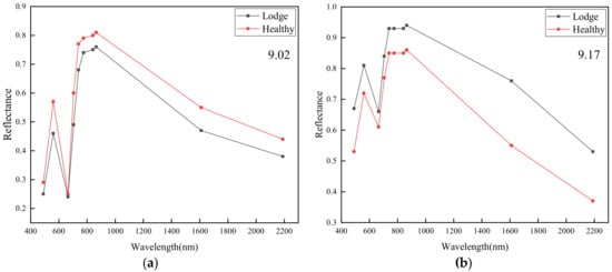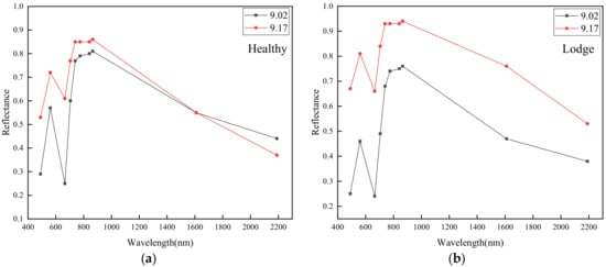 Figure 5. Average spectral variation of lodging and healthy rice on 2 September (a) and 17 September (b).