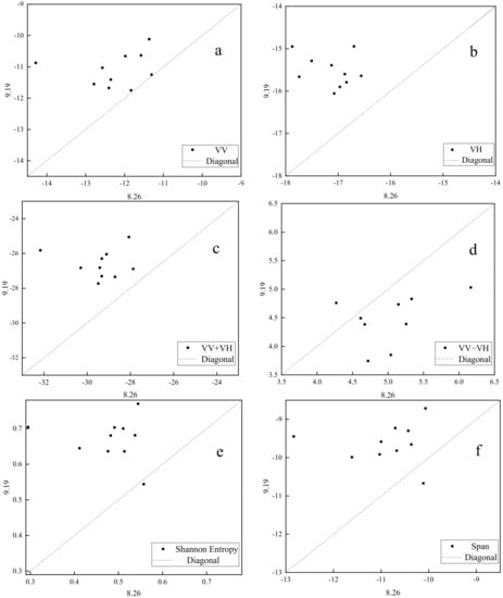Correlation scatterplots of SF screened by γ were constructed and each scatterplot included ten points (Figure 7). As the X and Y coordinate values of each point denotes SF values of one lodged sample plot before and after the typhoon, respectively, the distribution of these points reflects the consistency of SF changes after rice lodging. Here, VV, VH, VV + VH, VV − VH, Shannon Entropy and Span values changed after rice lodging, recording good consistency (scatter points are concentrated on the onside of line 1:1) (Figure 7). The value of β also indicated the consistency of parameter changes after rice lodging.
