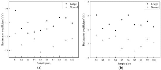 The significant increase in backscatter results recorded on 7 September associated to heavy rain, resulted in rice lodging to be overwhelmed. Therefore, images on 26 August and 19 September were only used to explore the capability of SAR in rice lodging mapping. Backscatter results (Figure 5a,b) indicate that backscatter coefficients of lodged rice sample plots (LS) significantly increased from 26 August to 19 September at VV and VH polarizations, and slight difference was recorded from 26 August to 19 September in healthy rice sample plots (HS).