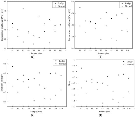 Figure 7. Change trend of lodging rice for (a) VV, (b) VH, (c) VV + VH, (d) VV − VH, (e) Shannon Entropy, (f) Span before and after lodging.