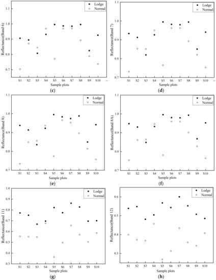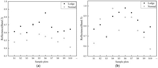 Discrimination scatter plots of all sample plots (S1-S10) for SF and SI (Figure 8 and Figure 9) were selected using screening steps 1 and 2, respectively. Results indicate that all selected OSPLs had almost no overlap between healthy and lodged sample rice plots, indicating that OSPL has sufficient ability to distinguish lodged rice from healthy rice.