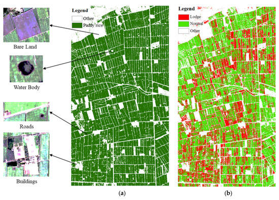 Figure 10. (a) Shape of rice region and detailed classification; (b) the RF classification result using the integrated OSF–OSI stack image.