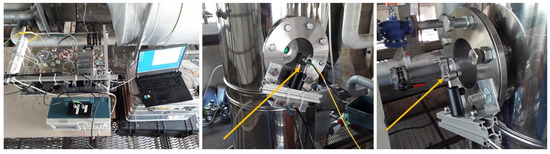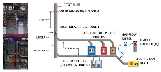The measurements were carried out at the Innovhub premises in San Donato Milanese (MI), Italy. The testing facility, used to validate the proposed technique, is a small-scale stack simulator, consisting of a flue generator and a vertical duct, where two measuring planes are available. A detailed description of the plant is shown in Figure 2. Real exhaust gases can be produced using one of the boilers connected to the plant; in particular, a 300 kW gas boiler, a 150 kW fuel oil boiler and a 100 kW biomass boiler are available. Otherwise, simulated exhausts can be produced using a fan, an electric heating unit and a steam generator; the flue gases produced this way can be more easily modulated since each of the parameters (namely flow rate, temperature and moisture content) can be set within a relatively large range. On the contrary, when a boiler is used, the composition, temperature and flow rate of the exhausts are mostly fixed, depending of the power and feed of the boiler, just minor adjustments can be produced by acting on the boiler’s settings. Both the real exhausts and the simulated fumes are conveyed through horizontal ducts to the same vertical stack, having a constant circular section of 300 mm of internal diameter (ID) and being 12 m high totally. The stack is a double wall stainless steel duct with a 25 mm thick thermal insulation. The gas is conveyed into the stack through a 45 inclined insertion duct; a coaxial section, consisting of a 250 mm inner duct, allows straightening the velocity field. Downstream, a screw-shaped mixing section is placed, in order to force the stream coming from the boilers to mix with the one coming from the fan, when both are necessary at the same time. The first measuring plane is located about 3 diameters downstream of this section. The second one is placed 3.54 m higher (i.e., 12 ID downstream). Both measurement points are equipped with two opposite flanged ports, housing the optical windows. About 5 m higher the fumes are released in the atmosphere. Additional ports for inserting probes used for the analysis of the gas composition and for the measurement of point velocity are located close to the two main measuring planes. The Pitot tubes used in the present work were placed 0.3 m above the upper measuring point. The injection point of the tracer was placed as far as possible from the measuring planes, so that the better possible mixing could be obtained. A small perforated pipe, inserted into the main duct close to the flue generator, was used to distribute the tracer in the mainstream. A gas bottle, containing the pure tracer, was connected to the injection point through a flexible PTFE tube; a pressure regulator was used to set the pressure of the tracer at the injection point. A quick connection hose was used to manually connect/disconnect the tracer carrying tube with the injection pipe at the beginning of each TT test. On the other hand, a calibrated mass-flow meter was used to feed a known amount of tracer during the dilution tests. The tracer is mixed with the fumes in the straight horizontal duct (about 10 m long), a further and more intense mixing is produced in the mixing section of the stack, previously described.