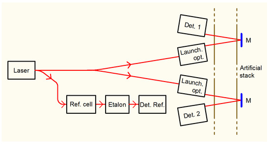 Block diagram of the optics. M: flat Mirror. The angle between the two couples of beams inside the stack is exaggerated for the sake of clarity.