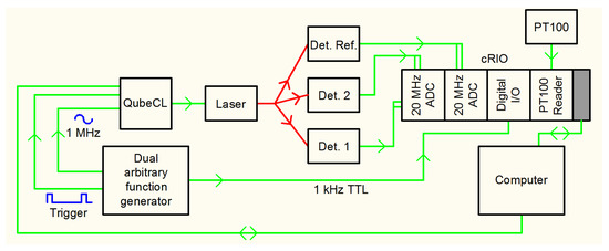 A block diagram of the electronics is shown in Figure 5. The laser is current-supplied and temperature stabilized by a commercial driver (ppqSense QubeCL). A National Instruments crate (cRIO 9067) hosts: two 4-channels, 20 MSamples/s acquisition rate each, 14 bits vertical resolution ADC plug-in’s (NI-9775); a programmable, 4-channels digital I/O plug-in (NI-9402); and a 4-channels PT100 reader (NI-9217) for housekeeping. An important feature of this crate is its FPGA, Xilinx Zynq-7000, with 85.000 logic cells and 106.400 flip-flops. A Tektronix double output Arbitrary Function Generator 3022 provided: the trigger (1 kHz) for the QubeCL to start the sawtooth ramp to sweep the laser frequency across an absorption profile, the TTL output signal for the digital I/O plug-in which starts the acquisition on the rising edge of the TTL, and the high frequency (1 MHz) sinusoid used for WMS. The latter signal was converted by the QubeCL into current, and added, together with the ramp, to the bias current of the laser. We used three detectors, Hamamatsu InGaAs mod. G12180-210A, 1 mm diameter, 2-stage Peltier cooling, 40 MHz cutoff frequency, two for the detection points and the third for the reference arm. Each detector is equipped with two outputs, low pass (<100 kHz) and high pass (>500 kHz) filtered. The outputs of the detectors are acquired by six channels of the NI-9775 modules. The low pass signals are used for DA and the high pass signals are used for WMS.