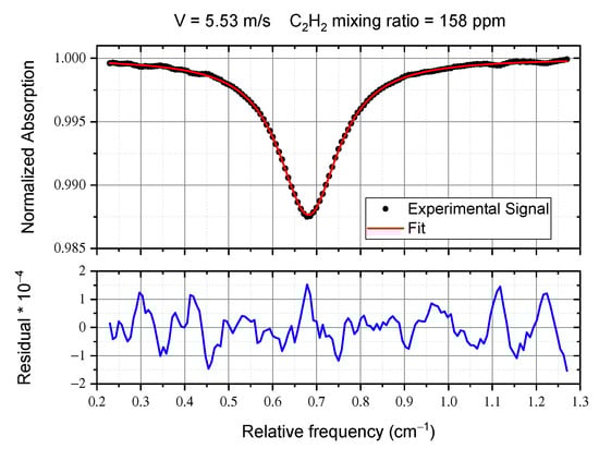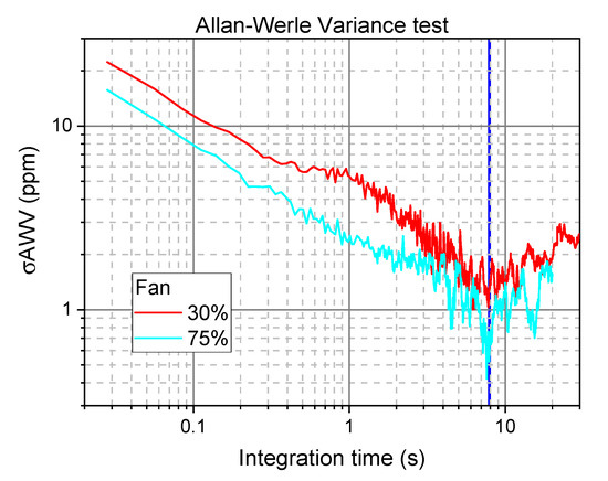 In order to verify the quality of our data, and to decide the best integration time for our measurements, we performed the Allan-Werle Variance [19,20] on mixing ratio measurements. Figure 6 shows the results obtained for two different speeds of the fan (expressed as % of the maximum speed). The best integration time results to be 8 s, corresponding to an Allan-Werle Variance of 1.5 ppm at 30% and 0.9 at 75%. The slight difference can be due to the different measurement conditions. It is worth noting that this is the Allan-Werle test of the whole system, formed by the fan, the mass-flow meter and our optical apparatus. Dilution measurements are stationary, so, according to the Allan–Werle analysis, we can further average over 285 scans, for 8 s total measurement time. Figure 7 shows the averaged absorption profile, with the fit curve and the residual.