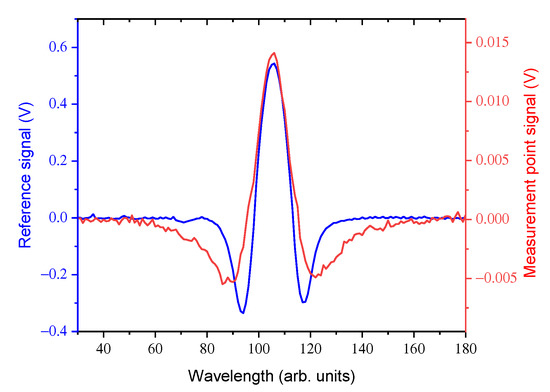 Wavelength Modulation Spectroscopy (WMS) signals from the reference cell (blue) and one of the measurement points along the stack (red).