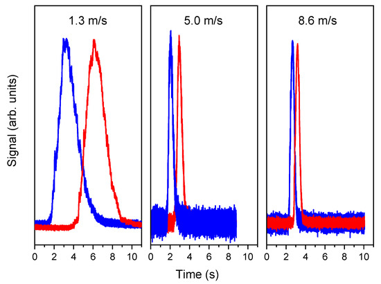 To obtain the concentration burst, the tracer gas line was closed and opened with a delay as short as possible. An example of the TT measurements, at two different points of the stack, at three different flow speeds, is reported in Figure 9. The velocity can be obtained by calculating the time delay between two corresponding timestamps of the red and blue curves of Figure 9. The selection of the timestamps is not a minor issue and it will be analyzed in the next section. The geometrical distance between the two measuring planes (3.54 m) divided by the delay yields the average gas velocity.