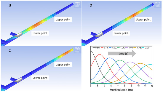 Computational fluid dynamic (CFD) tracer concentration profile along the stack axis (average velocity 6 m/s, T = 105 C). Time origin is the transit time of the tracer at the upper junction (grey in the figures). (a) 0.75 s; (b) 1.25 s; (c) 1.75 s.