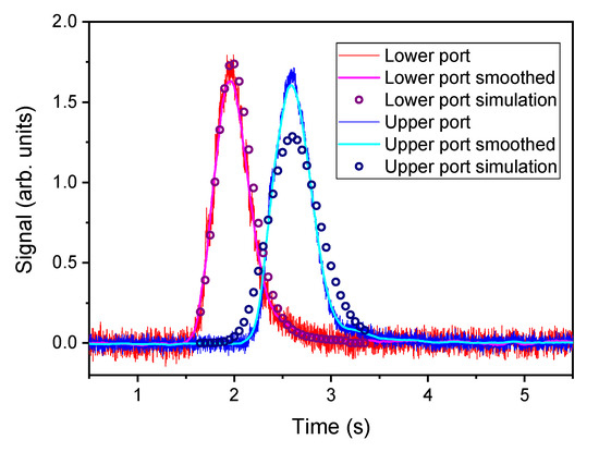 It can be observed that the increase/decay curve spans for a long distance along the vertical axis; from this point of view, these conditions are quite different from an ideal plug flow. The shape of the curve actually changes along the axis: its slope decreases and the peak broadens, as expected. In Figure 11 experimental and model results are compared: the signals of TT measurements collected at the lower and upper measuring planes are plotted together with the results of CFD simulation (circles) at the same test conditions. The broadening effect is produced by the combination of the bulk velocity of the flow and the diffusion velocity of the tracer molecules. The second peak in the simulation shows a larger broadening effect compared to the experimental results. It can be assumed that the adopted model of turbulence overestimated the turbulent diffusivity of the system. More advanced modeling, for instance including Large Eddy Simulation (LES) could have produced a better matching, but a fully detailed simulation is outside the scope of this work.