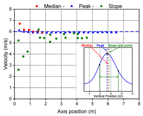 Molecular and turbulent diffusion produces an apparent velocity, which gives incorrect results if the reference timestamps of each curve are not selected properly. As far as an isotropic diffusivity is assumed, each molecule diffuses randomly in any direction: molecules mainly diffusing in the flow direction move faster than average fluid-dynamic velocity, while molecules diffusing mainly against the flow direction move slower than average fluid-dynamic velocity. Consequently, these points are not suitable for measuring the bulk velocity of the flow. The centroid of the tracer spike should be identified in order to get a correct result from the TT technique; EN ISO 16911-1 states that the best choice is the median of the concentration distribution. A specific analysis has been carried out to compare different possible criteria. The simulated concentration distributions can be used to compare the results one can expect by applying different approaches of calculation on the same data. In Figure 12 the average gas velocity was estimated from three different sets of points, on the simulated curves: the peak of the curve, the median, and the mid-point between the maximum slope at both sides of the peak (the inset shows the location of these points). These calculations have been repeated for several axial distances, in order to evaluate the effect of the separation between the two measuring points. The best matching with the known average actual velocity is produced using the peaks. The velocities calculated based on the median are equally in good agreement with the expected result, except for very short distances when velocities would be overestimated. The sloping approach produces more erratic results, probably due to the fluctuations produced by the numerical derivation of the curves. It is noteworthy, anyway, that the three points, selected on each curve, are quite close to each other, because of the symmetry of these curves, while many different results may be expected in more asymmetric conditions.