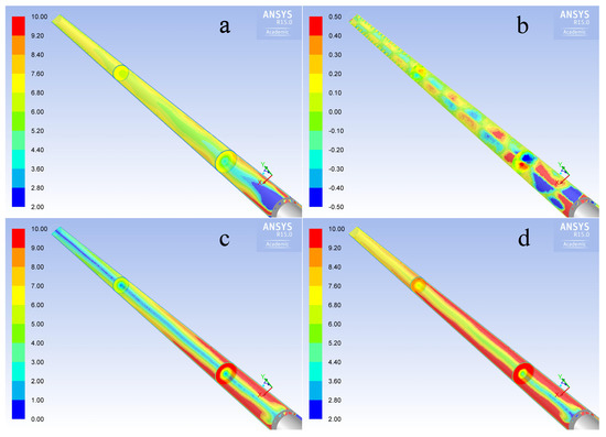 Simulated velocity field inside the stack simulator in all its components: (a) total, (b) axial, (c) radial and (d) tangential velocity. Units are m/s.