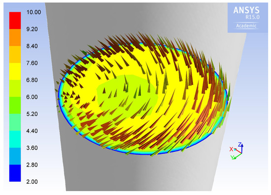 A simulation of the velocity field inside the stack was carried out in order to understand how critical is the positioning of the Pitot tube, due to the fact that the flow field inside the stack does not feature a cylindrical symmetry, but a complex behavior, as reported in literature [3,21]. Figure 13 shows the calculated components of the gas velocity along the stack. The velocity vectors on the horizontal section where the Pitot probe was installed are shown in detail in Figure 14: the flow field is strongly asymmetric and the vectors are inclined in a quite complex configuration. As a consequence, the location of the Pitot probe can critically affect the velocity measurements and deserves further investigation.