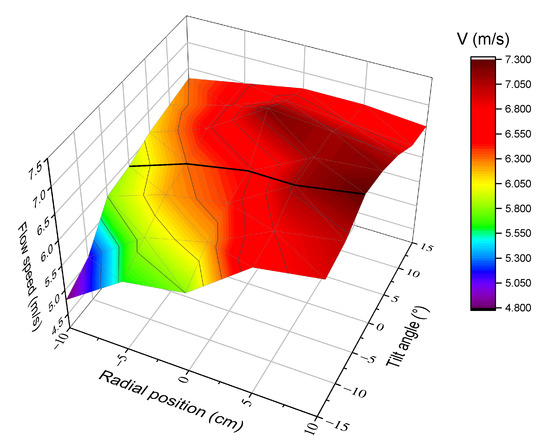 We do not describe the working principle of Pitot tubes, it is enough to say that an S-type Pitot, connected to a micromanometric device, specifically designed for in-stack velocity and flow rate measurements was used in the first series of intercomparison tests. This device is designed to be integral with the probe and has an integrated inclinometer. The Pitot tube was placed 0.3 m downstream the upper measuring plane and velocity measurements were carried at a fixed point on the central axis of the stack, in accordance with EN 15259 for ducts having an internal diameter smaller than 0.35 m. Despite this, it is not possible to be sure that this is the best choice in the specific case of a cyclonic and asymmetrical flow, such as the one studied in the previous section. Hence, we decided to investigate this feature in deeper detail. We performed a series of measurements, using the Pitot tube only, testing a flow of air at room conditions. The Pitot probe was inserted inside the stack at different distances from the duct axis (negative values mean between the port and the duct axis, positive values mean beyond the duct axis), and at different angles with respect to the vertical direction. The results of this test are shown in Figure 15. It is evident that the velocities are not constant along a diameter. Moreover, when tilting the Pitot probe, even by a few degrees, the readings change. From this investigation, we concluded that the reading at the central position is approximately equal to the average velocity on that line and only if the probe is strictly vertical. Just a little displacement along the axis or a small rotation is enough to read a quite different velocity.